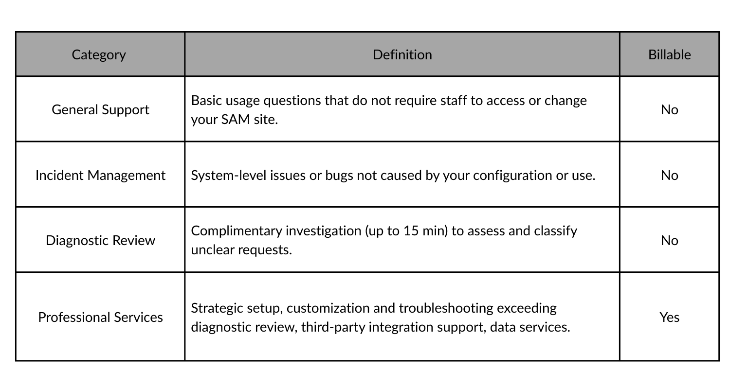 Professional Services: Covers requests that require configuration, troubleshooting, training beyond what is described above, or custom work performed inside your SAM site. These services are billable and subject to the process described in this Section.